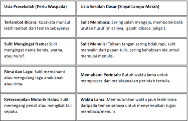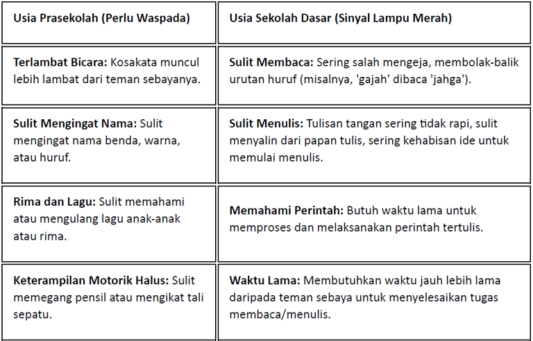 Gejala Disleksia bisa terlihat sejak usia prasekolah hingga usia sekolah. Berikut beberapa sinyal umum yang perlu Ayah/Bunda perhatikan: